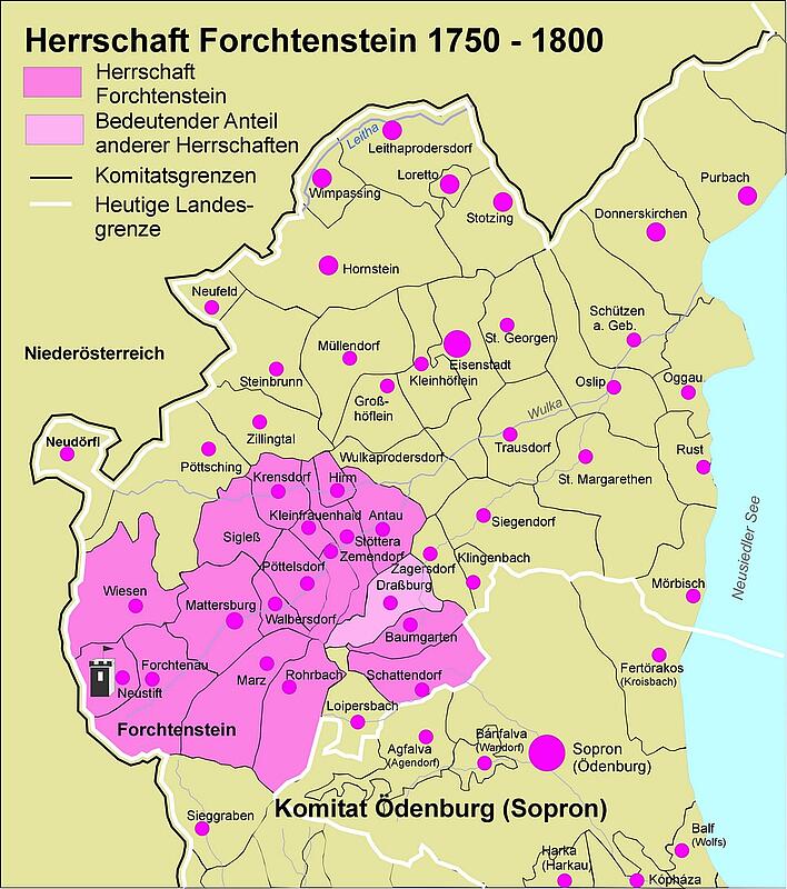 1738 wurden die Herrschaften Forchtenstein und Eisenstadt neu organisiert. Breitenbrunn, Großhöflein, der Anteil in Trausdorf und Wulkaprodersdorf kamen an Eisenstadt, Rohrbach und die Besitzanteile in Antau, Zemendorf und Marz an Forchtenstein, Müllendorf von der Herrschaft Forchtenstein an Hornstein, Pöttelsdorf von Hornstein an Forchtenstein. Baumgarten kam von der Herrschaft Lackenbach an Forchtenstein. 1740 dürfte Sieggraben an Kobersdorf gekommen sein.