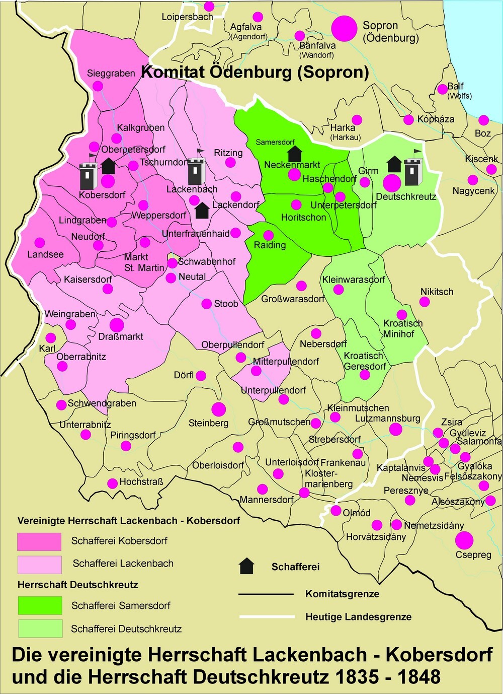 Am 1. Jänner 1835 kam es zu einer großen Gebietsreform. Aus den bisherigen drei Herrschaften Kobersdorf, Lackenbach und Deutschkreutz wurden zwei Herrschaften: Die Herrschaft Lackenbach - Kobersdorf mit den beiden Schaffereien Kobersdorf und Lackenbach und die Herrschaft Deutschkreutz mit den beiden Schaffereien Samersdorf und Deutschkreutz. Die bisher zu Lackenbach gehörenden Orte Neckenmarkt, Horitschon, Raiding, Unterpetersorf und Haschendorf wurden zur Herrschaft Deutschkreutz geschlagen und bildeten die Schafferei Samersdorf.