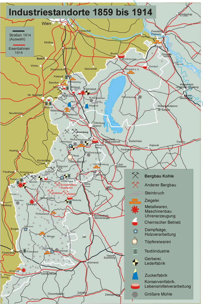 Die Kupfer-, Schwefel- und Eisenerzbergbau vor allem im Bernsteiner und Günser Gebirge spielten im 19. Jahrhundert keine Rolle mehr. Sie hatten über lange Zeit zur wirtschaftlichen Entwicklung Westungarns erheblich beigetragen. Im 19. Jahrhundert war neben dem Antimonbergbau vor allem die Braunkohleförderung für die Versorgung der vielen neuen Industrien im Wiener Becken von besonderer Bedeutung. Im Jahre 1888 wurden auf dem Gebiet des heutigen Burgenlandes etwa 1 100 000 Zentner Braunkohle und 3000 Zentner Antimon produziert. Größere Braunkohlebergbaue gab es in Neufeld, Pöttsching, Brennberg-Ritzing, Schreibersdorf und Mariasdorf. 1888 waren 346 Männer, 82 Frauen und 69 Kinder im Bergbau beschäftigt. Neufeld und Ritzing waren im Besitz der Esterházy, in Mariasdorf J. M. Miller & Comp., in Schreibersdorf Robert Schindler. Miller betrieb auch das Antimonbergwerk. Ab 1891 wurde die Kohleförderung durch Josef Picher in Schreibersdorf aufgenommen. In den folgenden Jahren stieg die Förderung von Braunkohle kontinuierlich. Erst um die Jahrhundertwende brach der Absatz ein, wegen der Konkurrenz der schlesischen Kohle und der Kohle aus dem ungarischen Tata. Das Ritzinger Bergwerk war 1902 nicht mehr in Betrieb. 1906 wurde nur mehr in Brennberg Kohle gefördert, auch Neufeld war schon eingestellt. Das hatte 1907 einen empfindlichen Kohlemangel zur Folge. Der Antimonbergbau blieb bis 1990 in Betrieb. Der Tauchener Kohlebergbau wurde 1967 eingestellt.