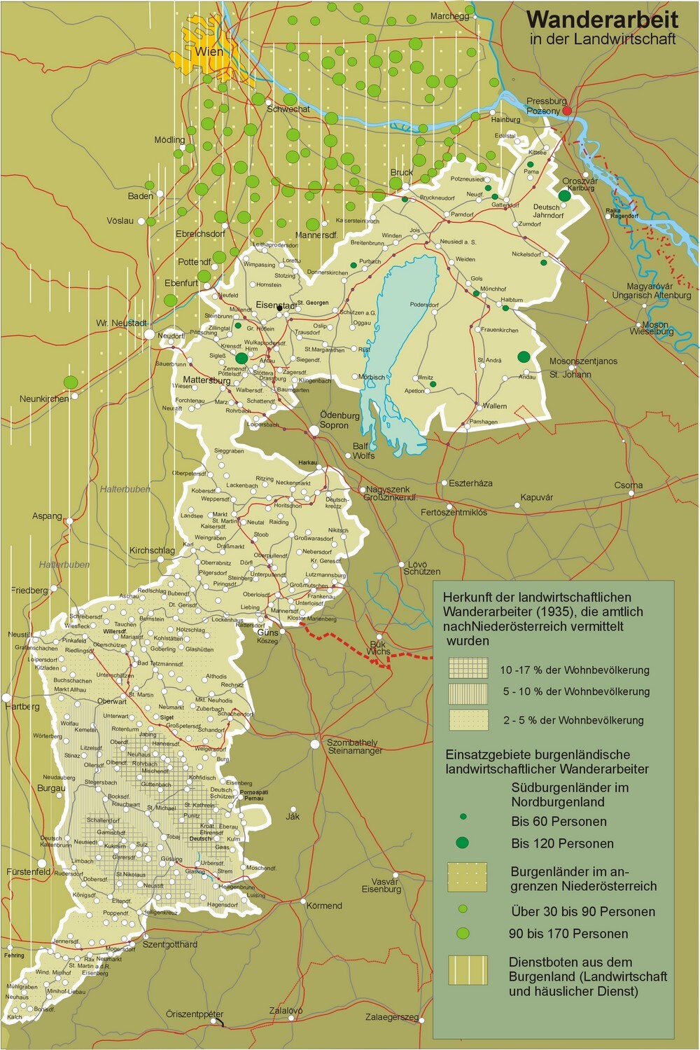 Die meisten landwirtschaftlichen Saisonarbeiter kamen aus dem Güssinger Bezirk. Hier waren zeitweise nahezu 30 % der arbeitsfähigen Bevölkerung als Saisonarbeiter tätig. Auch der Oberwarter Raum war ein wichtiges Herkunftsgebiet der Saisonarbeiter. In der Zwischenkriegszeit gingen viele Gutsbetriebe dazu über, billigere Arbeitskräfte aus der Slowakei anzustellen. Diese verdrängten die burgenländischen Saisonarbeiter. Erst in der Weltwirtschaftskrise, mit steigender Arbeitslosigkeit, wurden die ausländischen Arbeitskräfte durch Burgenländer, die von den Arbeitsämtern vermittelt wurden, ersetzt. Vereinzelt gab es auch noch nach dem zweiten Weltkrieg landwirtschaftliche Saisonarbeit, die aber mit der Mechanisierung der Landwirtschaft verschwand. Die zunehmend bessere Verkehrserschließung machte die besser bezahlte Arbeit als Pendler in Gewerbe und Industrie attraktiver.