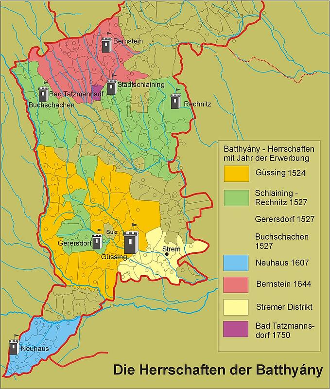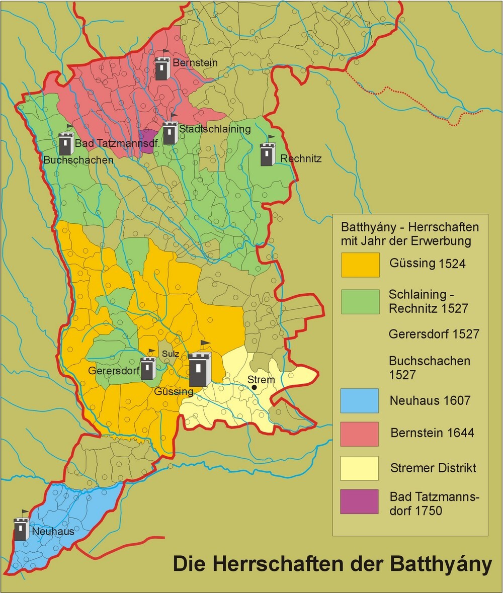 Am 30. Juni 1524 wurden Franz Batthyány und sein Neffe Christoph von König Ludwig II. mit Burg und Herrschaft Güssing und dem Distrikt Strem belehnt. Damit kam jene Familie in den westungarisch-burgenländischen Raum, die neben den Esterházy das Schicksal dieses Landstriches am stärksten bestimmen sollte. Im Laufe der Zeit konnten sie die Herrschaften Schlaining, Rechnitz, Körmend, Neuhaus, Bernstein, Szentgrót und Rabakicsány erwerben.