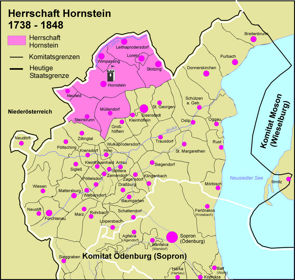1738 wurden die Herrschaften Forchtenstein und Eisenstadt neu organisiert. Breitenbrunn, Großhöflein, der Anteil in Trausdorf und Wulkaprodersdorf kamen an Eisenstadt, Rohrbach und die Besitzanteile in Antau, Zemendorf und Marz an Forchtenstein, Müllendorf von der Herrschaft Forchtenstein an Hornstein, Pöttelsdorf von Hornstein an Forchtenstein. Baumgarten kam von der Herrschaft Lackenbach an Forchtenstein. 1740 dürfte Sieggraben an Kobersdorf gekommen sein.