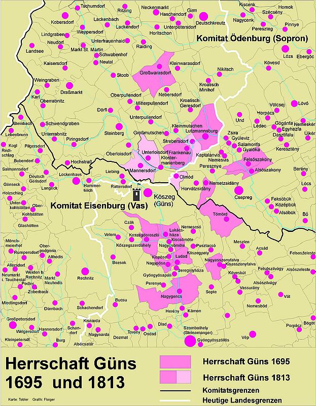 Zur Herrschaft Güns gehörten damals 13 Ortschaften, darunter der Marktort Lutzmannsburg, Großwarasdorf und Frankenau auf heute burgenländischem Gebiet sowie die Orte Alsó- und Felsőszakony (Unter- und Oberzackersdorf). Die fünf Orte befanden sich im Ödenburger Komitat, während das Hauptgebiet der Herrschaft südlich und östlich der Stadt Güns mit Ausnahme von Német-Zsidány (Rockendorf) bereits im Komitat Eisenburg (Vas) lag und die acht Orte Doroszló, Lukácsháza (Lukatschhofen), Nagypöse, Ludad, Német-Zsidány, Tömörd (Demetern), Asszonyfa und Genes (Gensdorf) umfasste.