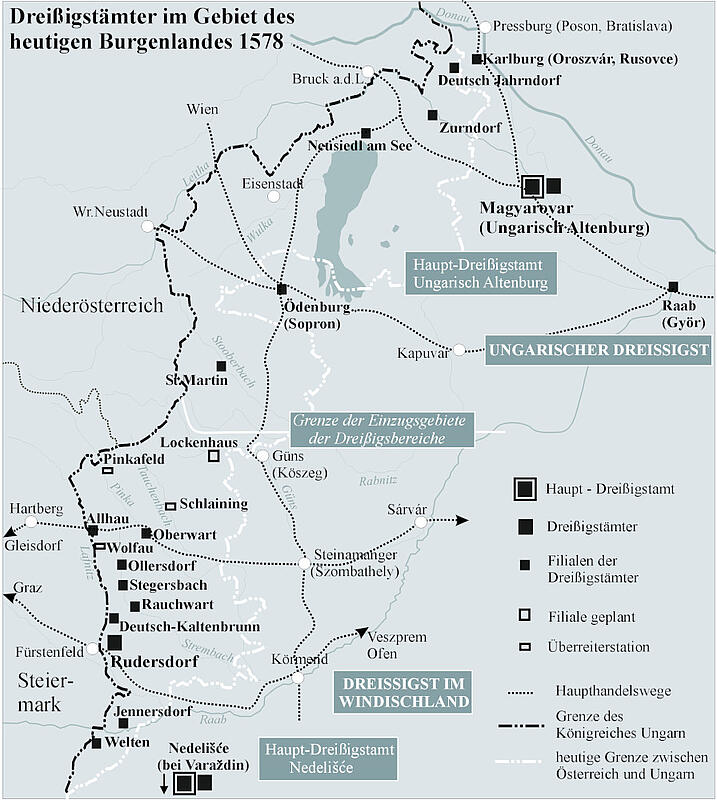 Südlich der Donau hatte sich Ungarisch Altenburg zum Hauptdreißigstamt bis in die Gegend von Güns entwickelt. Ihm unterstanden die Dreißigstämter Deutsch Jahrndorf, Karlburg, Raab, Zurndorf, Neusiedl am See, Ödenburg, St. Martin. Früher waren Rust, Mörbisch und Kroisbach Filialen von Ödenburg. Der Dreißigst im Windischland begann bei Pinkafeld. Rudersdorf war ein Nebendreißigstamt, zu dem die Filialen Oberwart, Allhau, Deutsch Kaltenbrunn, Stegersbach, Ollersdorf, Rauchwart, Welten, Jennersdorf und Henndorf gehören.