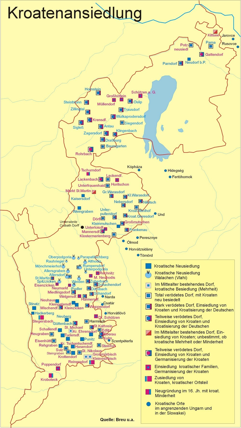 Vor 1515 tauchen in der Herrschaft Eisenstadt bereits vereinzelt kroatische Familiennamen auf. 1524 erhielt der kroatische Adelige Michael Butschitsch in Wien von Erzherzog Ferdinand die Erlaubnis, " mit ettlichen seinen Lewten heraus in Österreich zu ziehen und alda zu wonen" (zitiert nach Breu, Josef: Die Kroatensiedlung im Burgenland, S. 16) Der Beginn der Auswanderung wird zumeist in die Zeit zwischen 1493 und 1515 gesetzt. 1524 ersuchte Franz Batthyány, der Banus von Kroatien, König Ludwig um Erlaubnis, kroatische Bauern aus Kroatien und Slawonien in seinen westungarischen Herrschaften ansiedeln zu dürfen. 1522 bis 1527 wanderten Kroaten in einer ersten großen Auswanderungswelle aus der Lika, aus den Hochbecken von Gacka und Krbava und aus dem Küstenland zwischen Zengg (Senj) und Obrovac nach Westungarn, in die Umgebung von Ödenburg. 1627 weist das Urbar der Herrschaft Eisenstadt vor allem in Oslip eine größere Zahl von kroatischen Untertanen auf. 1532/33 folgten Aussiedler aus dem Gebiet zwischen Otocac und der Kupa in die Steiermark und in die Umgebung von Wien. Der größte Wanderungsschub erfolgte 1537 bis 1543, als die Türken Westslawonien verwüsteten. Die Nádasdy, Batthyány und die Erdödy, die dort Besitzungen hatten, brachten ihre Bauern nach Westungarn. Die Umsiedlung erfolgte meist in Gruppen unter der Leitung von Kleinadeligen (Lokatoren). Das fahrbare Hab und Gut wurde auf den beschwerlichen, meist zwei bis drei Wochen dauernden Marsch mitgenommen. Die Konvois wurden immer wieder von Martolosen angegriffen. Über die großen Flüsse wurden Schiffsbrücken errichtet. Die große Wanderung fand vor allem in den 1540er und 1550er Jahren statt, setzte sich aber auch noch in der zweiten Jahrhunderthälfte fort. Die wichtigsten Herkunftsgebiete der burgenländischen Kroaten waren die Moslavina in Slawonien, Nordbosnien und das Gebiet zwischen Una und Kulpa. Die erste Hauptwelle kam in den Jahren 1533 bis 1545 in den Herrschaften Hornstein, Eisenstadt, Forchtenstein, Güns und Güssing an. Nach 1540 kamen die Kroaten der Herrschaften Rechnitz, Schlaining und Rotenturm. Nach dem Fall von Kostajnica 1556 setzte eine weitere Welle ein aus dem Gebiet zwischen Una und Kulpa, vor allem in das Wieselburger Komitat, in das Ödenburger Komitat, in das Marchfeld, nach Mähren und in die heutige Slowakei, aber auch in die Herrschaften Eberau und Rotenturm. Nach dem Fall von Szigetvár 1566 kam erneut eine Flüchtlingswelle. Damals wurden Parndorf und Neudorf neu besiedelt. Um die Mitte der 1570er Jahre ging der Einwanderungsstrom zurück, da man in Niederösterreich und in den verpfändeten Herrschaften in Westungarn nicht mehr bereit war, diese aufzunehmen. In den 1580er Jahren endete die Wanderung. Einzelpersonen - Kleinadelige, Priester, Lehrer, Handwerker - kamen auch weiterhin.