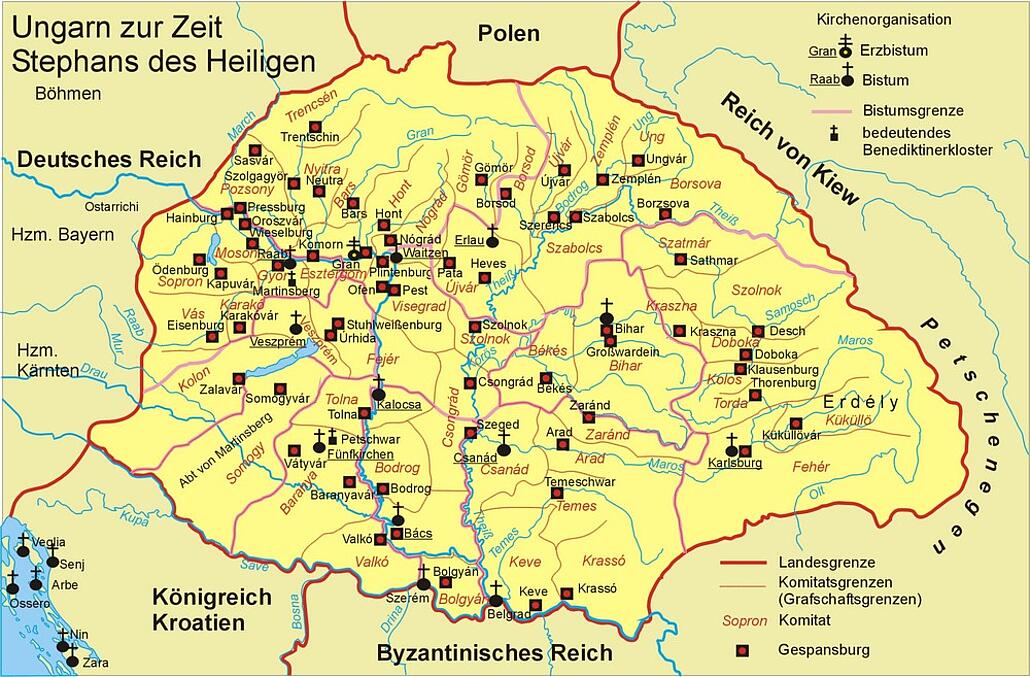 Interessant ist, dass die neue weltliche Gebietsorganisation der Gespanschaften und Komitate und die kirchliche Organisation weitgehend übereinstimmten. Sie entstanden ja etwa zur gleichen Zeit. Die Dekanatskirchen befanden sich in den Komitatsburgen, die Dekanatsbezirke deckten sich weitgehend mit den Komitaten.
