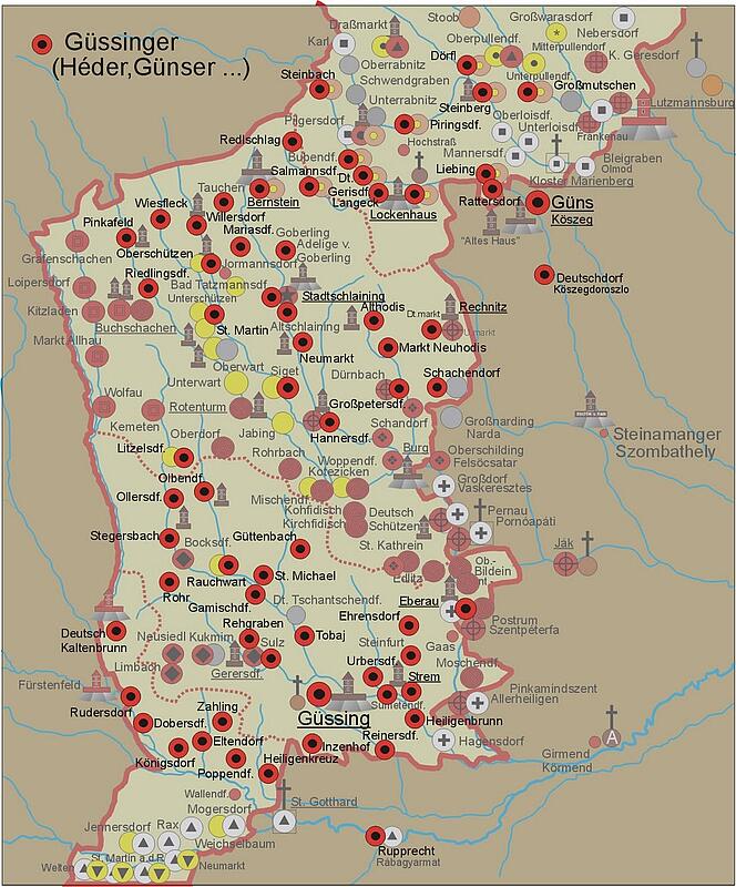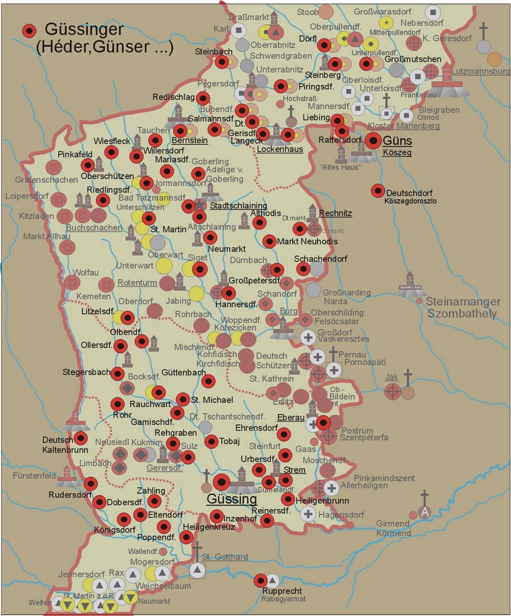 Die Güssinger beherrschten gegen Ende des 13. Jahrhunderts den Großteil des westungarischen Grenzraumes sowie Gebiete in der heutigen Slowakei und in Slawonien. Unter anderem gehörten die Burgen und Herrschaften Bernstein, Schlaining, Pinkafeld, Güns (Köszeg), St. Veit (Velem) und Lockenhaus zum ausgedehnten Güssinger Herrschaftsbesitz. In der ersten Hälfte des 14. Jahrhunderts teilte sich das Geschlecht der Güssinger in drei Linien: in die Bernsteiner Linie, in die Lockenhauser Linie und in die Rechnitzer Linie.