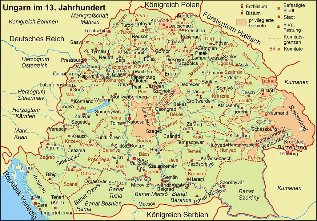 Zum wichtigsten Instrument der königlichen Herrschaft wurde das Komitat (Grafschaft, Gespanschaft, ungarisch megye). Ursprünglich gehörte alles Land dem König. Die ortsansässige Bevölkerung galt wohl nach dem Erobererrecht generell als unfrei. Aus den königlichen Besitzungen wurden diese Verwaltungs- und Verteidigungseinheiten mit einer königlichen Komitatsburg als Zentrum gebildet. Vorbild war dabei die Grafschaftsverfassung des fränkisch – deutschen Reiches. Der Ispan (Gespan, vom slawischen Zupan abgeleitet) oder Comes (Graf) war der Vertreter der königlichen Macht. Allmählich setzten die Könige seit Stephan dem Heiligen die Einteilung des Landes in Komitate durch. In Konkurrenz zum vielfach opponierenden, zum Teil noch heidnischen Stammesadel entstand so eine dem König verpflichtete Gefolgschaft, die ungarischer, aber auch ausländischer Herkunft war. Jene Großen aus dem Stammesadel, die sich der Königsgefolgschaft anschlossen, behielten einen beträchtlichen Grundbesitz, über den sie frei verfügen konnten. Sie stellten auch einen Teil der Gespane. Andere kamen aus der Gruppe von Zuwanderern und Aufsteigern, die sich im Dienst für den König bewährt hatten. Sie erhielten Donationsgüter von beträchtlichem Umfang.