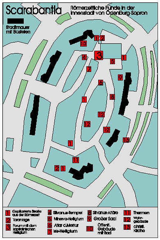 Nach den Markomannen- und Quadenkriegen wurde die Stadt Scarabantia wieder aufgebaut. In den folgenden Jahrzehnten blieben die Städte im Inneren der Provinz von Einfällen verschont. Ab etwa 260 begann die Situation aber wieder sehr gefährlich zu werden. Erneut häuften sich die Barbareneinfälle. Sie hatten zur Folge, dass im ausgehenden 3. Jahrhundert nun auch die Binnenstädte der Provinz Pannonien wie Savaria und Scarabantia auf Anordnung des Staates und mit Hilfe des Militärs befestigt wurden. Die nunmehr errichtete Stadtmauer von Scarabantia umschloss nicht die ganze Stadt, sondern nur deren Kern mit den wichtigsten Gebäuden. Diese Stadtmauer ist bis heute zu einem großen Teil erhalten, weil sie später in das mittelalterliche Befestigungssystem einbezogen wurde.
