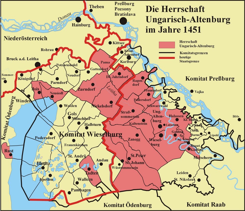 Für einige Jahrzehnte konnte der königliche Fiskus seine Hand auf Burg und Herrschaft Ungarisch Altenburg legen. Die Könige setzten Kastellane und Hauptleute ein. Um 1350 hatte diese Position Ulrich Wolfurt (Wolfart) inne. Er war kurz zuvor aus dem heutigen Vorarlberg eingewandert. König Ludwig I. förderte ihn ganz besonders und belehnte ihn mit der Burg Vöröskö (Bibersburg, heute Cervený Kamen in der Slowakei). Ulrich erwarb die Herrschaft als Pfandbesitz. Ulrich war Obergespan von Wieselburg, Ödenburg und Eisenburg. 1264 löste König Ludwig I. die Herrschaft von den Söhnen Ulrichs, Eglolf und Konrad, wieder ein. 1359 erwarben die Wolfurt die Herrschaft Hirnstein. 1414 erhielten die Wolfart von König Sigismund wieder als Pfand. Paul von Wolfart starb ohne männliche Nachkommen. Seine Witwe Judith vermählte sich 1441 mit dem Grafen Georg II. von St. Georgen - Bösing. Die St. Georgener konnten sich in einem Jahrzehnte langen Erbstreit mit den Verwandten der Wolfart behaupten. 1459 erhielten Johann III. und Sigismund von St. Georgen-Bösing auch Schloss und Herrschaft Bruck verpfändet. In der Auseinandersetzung zwischen Friedrich III. und Matthas Corvinus standen die St. Georgener zunächst auf der Seite Friedrichs und waren 1459 auch an dessen Wahl zum ungarischen König in Güssing beteiligt. Sie waren auch Kreditgeber Friedrichs und erhielten von ihm eine Wappenverbesserung und das Recht, mit rotem Wachs zu siegeln. Mit König Matthias standen sie auch deshalb nicht auf gutem Fuß, weil dieser gegen sie eingeschritten war, als sie der Stadt Pressburg die königlichen Zollstätten Karlburg, Zurndorf, Deutsch Jahrndorf und andere enteignet hatten. Die Unzufriedenheit mit Friedrich bewog auch die St. Georgen-Bösinger wie viele andere Hochadelige Westungarns, zu Matthias Corvinus zu wechseln. Sie wurden dafür in den Stand der erblichen Reichbarone erhoben. Sigismund von St. Georgen-Bösing erhielt sogar das Münzrecht. Im Dienst für Corvinus scheinen sie sich jedoch finanziell verausgabt zu haben. Sie verpfändeten den Markt Neusiedl an Johann Rauscher. Auch andere Orte wurden verpfändet.