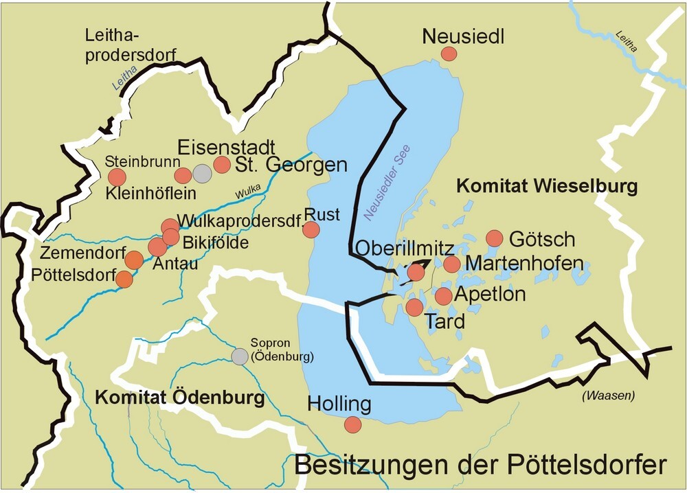 Csepan erhielt als königlicher Dienstmann anschend Götsch als Schenkung. Sein Sohn Lambert bekam von König Bela IV. das Burgland Tard. Apetlon wurde in der Zeit der Thronwirren von den Gutkeled besetzt, von König KarlI. Robert an die Götsch zurückgegeben. Die Götsch traten in den Dienst der Mattersdorf - Forchtensteiner. Mit den Osl stritten sie um Tard. Auch die Götscher Linie nannte sich später "von Pöttelsdorf". Ihr bedeutendster Vertreter war Thomas, dem 1340 die Erwerbung von Wulkaprodersdorf gelang. Auch in Neusiedl kaufte er zwei Lehen, ebenso Kleinadelsbesitzungen in Antau. In Antau wurde ihm die Hälfte des Dorfes zugesprochen, die andere Hälfte gelangte an die Zemendorf - Antauer. Johann I., der Sohn des Thomas, konnte eine andere Linie der Pöttelsdorfer beerben, erwarb die zweite Hälfte von Bikifölde und weitere Anteile in Anatu. Martin II., Angehöriger eines anderen Zweiges der Pöttelsdorfer, geriet in einen heftigen Streit mit den Mattersdorf - Forchtensteinern um seine Besitzungen in Holling, Pöttelsdorf und Steinbrunn. Die Mattersdorf - Forchtensteiner wurden wegen der anscheinend schwerwiegenden Übergriffe vom Palatin sogar zum Verlust von Hab und Gut verurteilt. Vor dem Raaber Domkapitel kam es schließlich zu einem Ausgleich. Martin II. (Mertlein), so wie sein Vater Nikolaus auch Lambert genannt, erhielt eine Geldentschädigung von den Kanizsai, den Verwandten der Mattersdorf-Forchtensteiner. Nach dem Erlöschen dieser Linie erhielt ihr Erbe Johann I., Sohn des Thomas von Pöttelsdorf. Dieser Johann erwarb 1401 Oberillmitz. Dessen drei Söhne starben ohne Erben, 1410 wird Leonhard als letzter genannt. König Sigismund erklärte ihr Erbe für an die Krone heimgefallen. Dazu gehörte ein noch immer beträchtliches Vermögen: Apetlon, Oberillmitz, Martenhofen, Tard, Bikifölde sowie Besitzanteile in Pöttelsdorf, Steinbrunn, Zemendorf, Antau und Neusiedl, Weingärten in Kleinhöflein und Rust. Der König überließ diese Besitzungen für 3032 Gulden den aufstrebenden Kanizsai