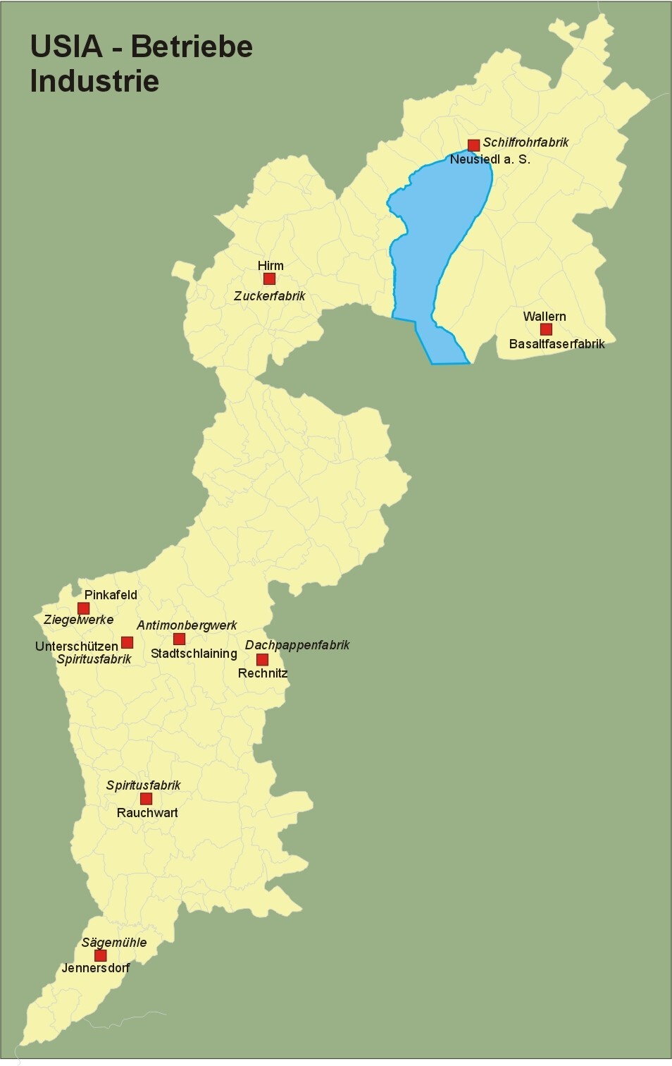 Die wirtschaftliche Situation Das Burgenland hatte in der Rüstungsindustrie des Dritten Reiches keine wichtige Rolle gespielt. Lediglich einige Fertigungsstätten wurden in aufgelassene Fabrikshallen verlegt, etwa die Messerschmittfertigung in Neudörfl (Wr. Neustädter Flugzeugwerke) oder die Fertigung von A 4 (=V 2) Raketenteilen im Zillingdorfer Wald (Rax-Werke Wr. Neustadt). Für die Wehrmacht produzierten Hutter und Schranz (Drahtwaren) und Alexander Putsch (Decken) in Pinkafeld sowie die Berndorfer Metallwarenfabrik in Großpetersdorf. Von großer Bedeutung war der Schlaininger Antimonbergbau der Bleiberger Bergwerksunion. Die Situation der Industrie 1945 war durch Zerstörungen und Demontagen durch die Sowjetarmee gekennzeichnet. Maschinen, aber auch Rohstoffe und Waren wurden beschlagnahmt. Fünf Betriebe mit 284 Arbeitern und 36 Angestellten wurden als „deutsches Eigentum“ von den Sowjets übernommen, etwa der Antimonbergbau, das Sägewerk in Jennersdorf und die Neusiedler Schilfverwertung der Gebrüder Müller. Diese Betriebe wurden dem sowjetischen USIA-Konzern eingegliedert. Dazu kamen zwei landwirtschaftliche Betriebe mit 525 Arbeitern und 114 Angestellten. Auch die Esterházy-Domäne, etwa 32.000 ha, wurde von der USIA übernommen, die in den Forsten Raubbau betrieb. Landwirtschaftliche Flächen wurden durch Pachtverträge an Kleinbauern und Landarbeiter vergeben und wurden zu einem politischen Druckmittel der Besatzungsmacht zugunsten der KPÖ.
